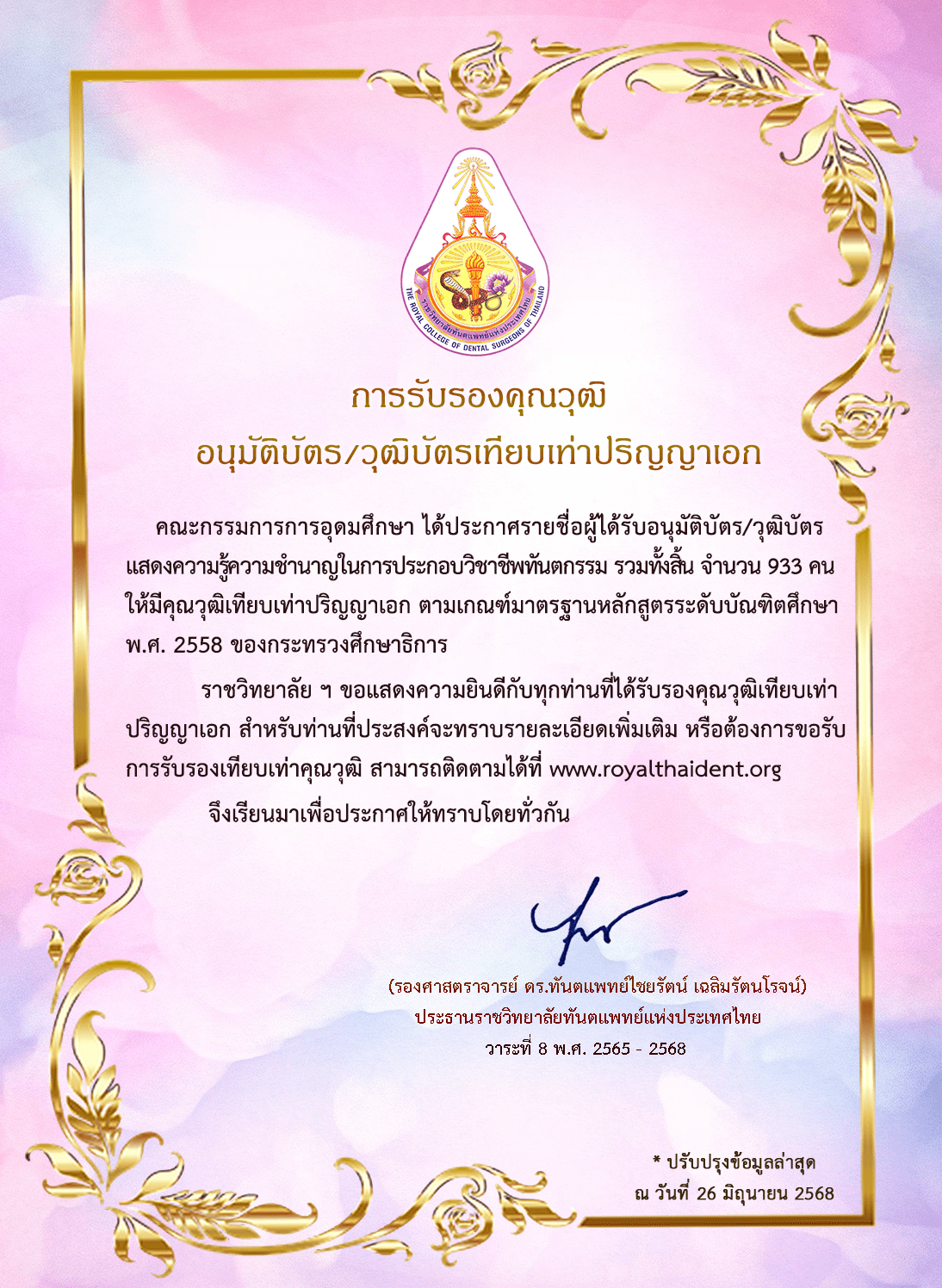 ประกาศฯ เรื่อง รายชื่อผู้มีสิทธิสอบเพื่ออนุมัติบัตรหรือวุฒิบัตร ประจำปี 2568 สาขาปริทันตวิทยา