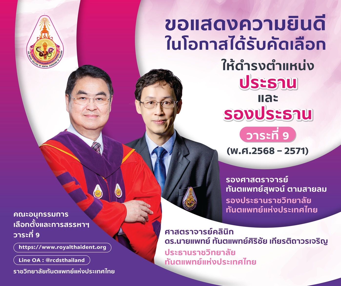 ประกาศคณะอนุกรรมการอำนวยการเลือกตั้งฯ เรื่อง รายชื่อผู้ได้รับการเสนอชื่อและสมัครเข้ารับการเลือกตั้งเพื่อดำรงตำแหน่ง ประธานและรองประธานราชวิทยาลัยทันตแพทย์แห่งประเทศไทย วาระที่ 9 (พ.ศ.2568 - 2571)